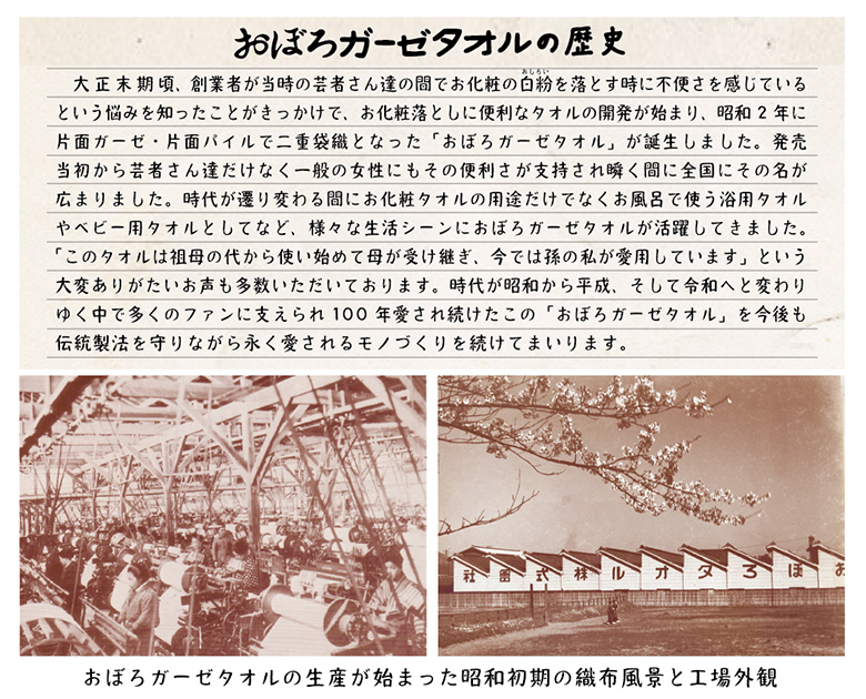 今回はおぼろガーゼタオル生誕100年を記念して発売当初のレトロなパッケージと織ネームのデザインを再現した「昭和復刻版」として発売することとなりました。