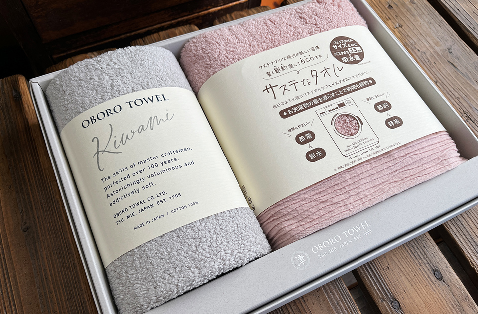 おぼろタオルのギフトセットは、専用のギフトボックスに商品をお詰めし、オリジナルの包装紙でお包み致します。